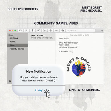 Send us a DM on IG @bcufilsoc to connect with us!